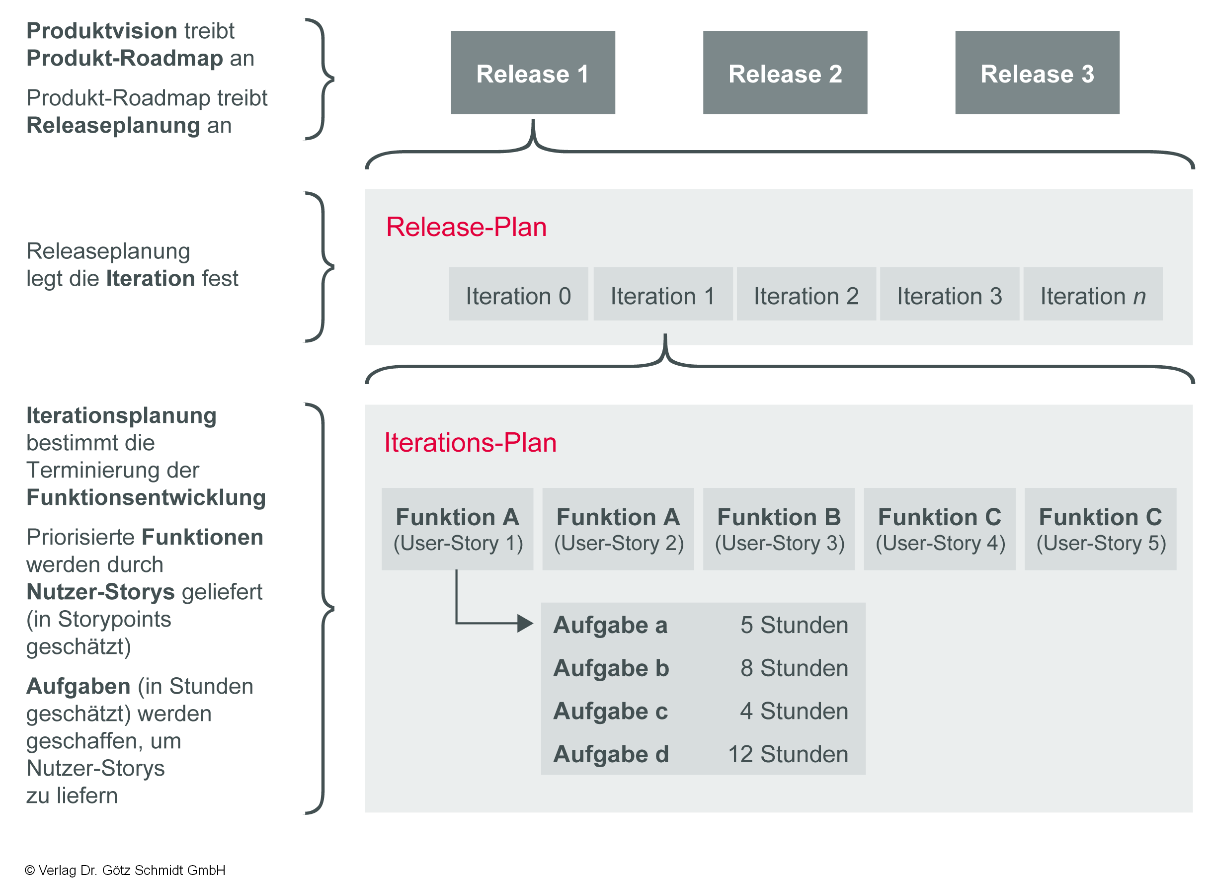Abb. 3.020 Beziehungen zwischen Produktvision, Release- und Iterationsplanung (PMI 2023)